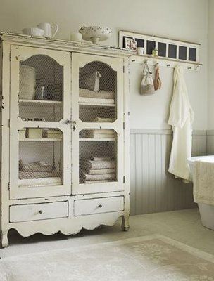 En el baño para lograr el shabby utilizamos muebles antiguos reciclados tan característicos de este estilo en tonos rosa, celeste, blanco ..muchas flores en estampados, en floreros, cajas para organiz ...