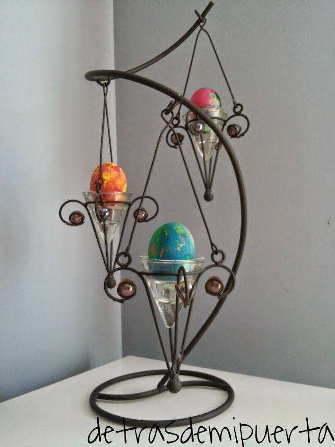 Hoy, os enseño los huevos de Pascua, que pintaron las peques de la casa, la Semana Santa del año pasado (que hizo malísimo). Vaciamos los huevos haciendo un pequeño agujero, pinceles y temperas y a pintar. Usamos este candelabro sustituyendo las velas por los huevos y quedaron así de chulos.