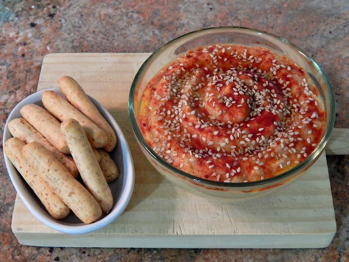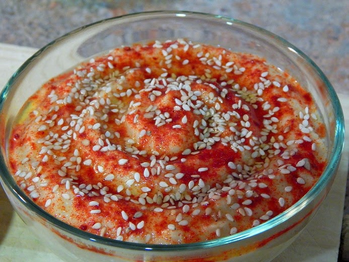Pour out the mixture into a bowl and do an espiral groove with the help of a tablespoon (that"s just for a good presentation). Sprinkle some paprika and sesame seeds on the top. Finally, add a stream of extra virgin olive oil.