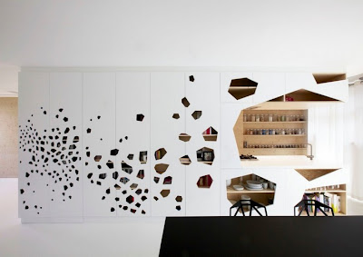 Armarios que van hasta el techo, pintados de blanco, y que muestran recortes hechos con láser.
