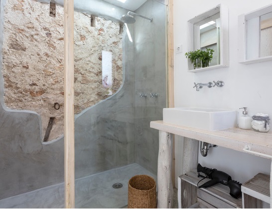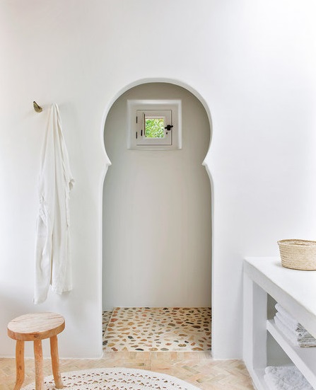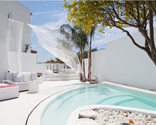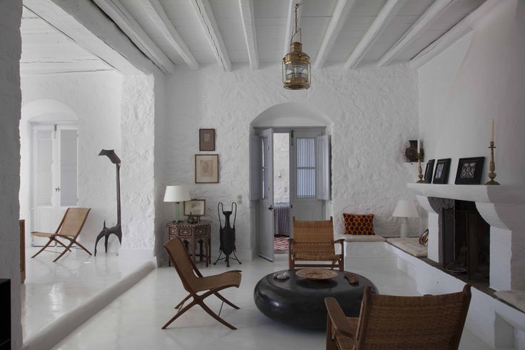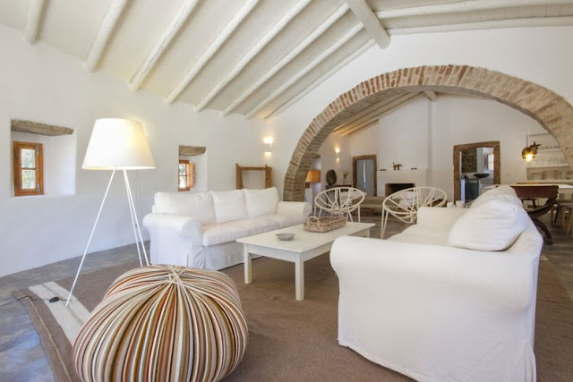 El blanco es el auténtico protagonista no solo para exterior también en interior. Combinado con la paleta de colores naturales. Materiales como la madera casi en estado bruto, muebles rústicos de líneas sencillas, mucha presencia de fibras naturales para los textiles, cortinas, colchas, cojines (en lino o algodón) y para artículos decorativos, cestos de mimbre, alfombras de esparto.
