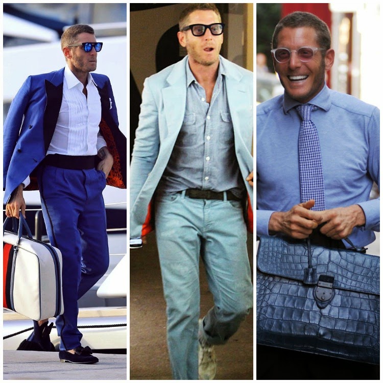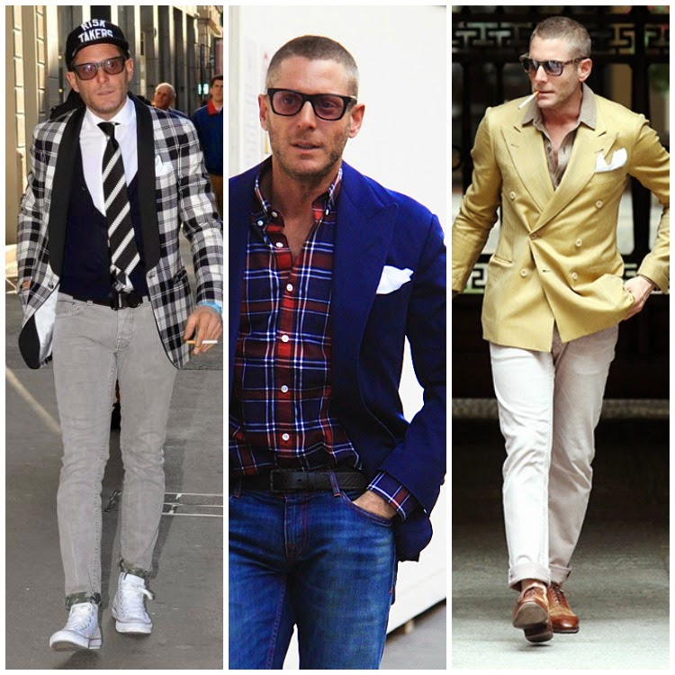 Y como habréis observado, las chaquetas de doble botonadura cruzadas son sello inconfudible, y las lleva con todo, con vaqueros, chinos, pantalón de vestir, alpargatas o zapatillas. A eso lo llamo yo sacarle partido al armario masculino, que luego todos se quejan de que las chicas podemos hacer más combinaciones que ellos, pero claro, en cuanto que les innovas un poco te dicen aquello de "que te crees, que voy a salir a la calle así disfrazado?".