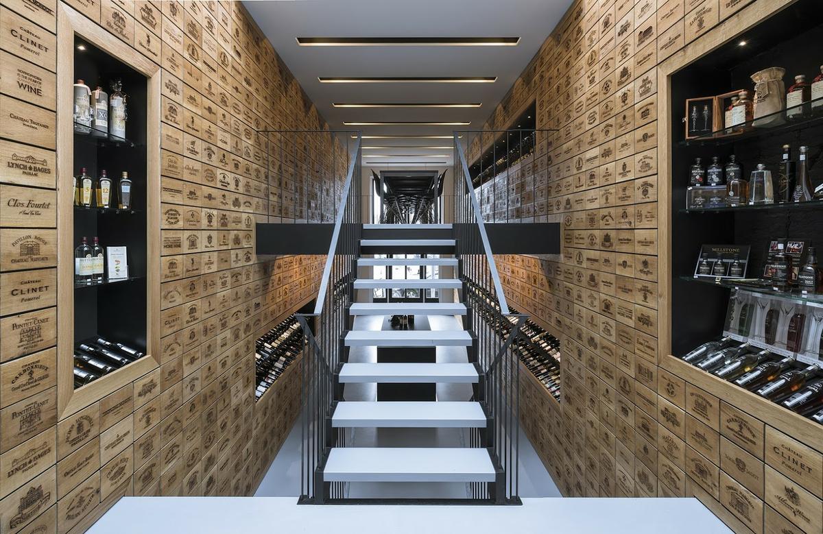 Podríamos desarrollar este negocio en cualquier tipo de local, pero éste además tiene una morfología perfecta para la idea. Se trata de un local de unos 200 mts2 cuyas paredes laterales se ha cubierto de placas de madera con marcas de vino grabada. Después han dividido el local en 4 alturas para diferenciar las distintas zonas del local. La primera en la que puedes ver los vinos más comunes y conocerlos, con una barra central donde los dependientes te los exponen. Una segunda zona que está como en un semisótano donde están los vinos más caros, el gourmet. Están los vinos expuestos en unas barras llenas de gravilla fina y las paredes pintadas de negro. Aquí puedes ver cómo simplemente cambiando la forma de exponer los vinos, lanzas la idea de que se trata de vinos más caros.