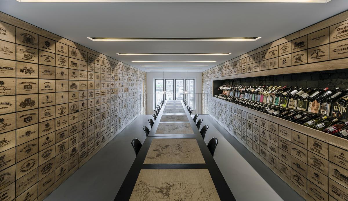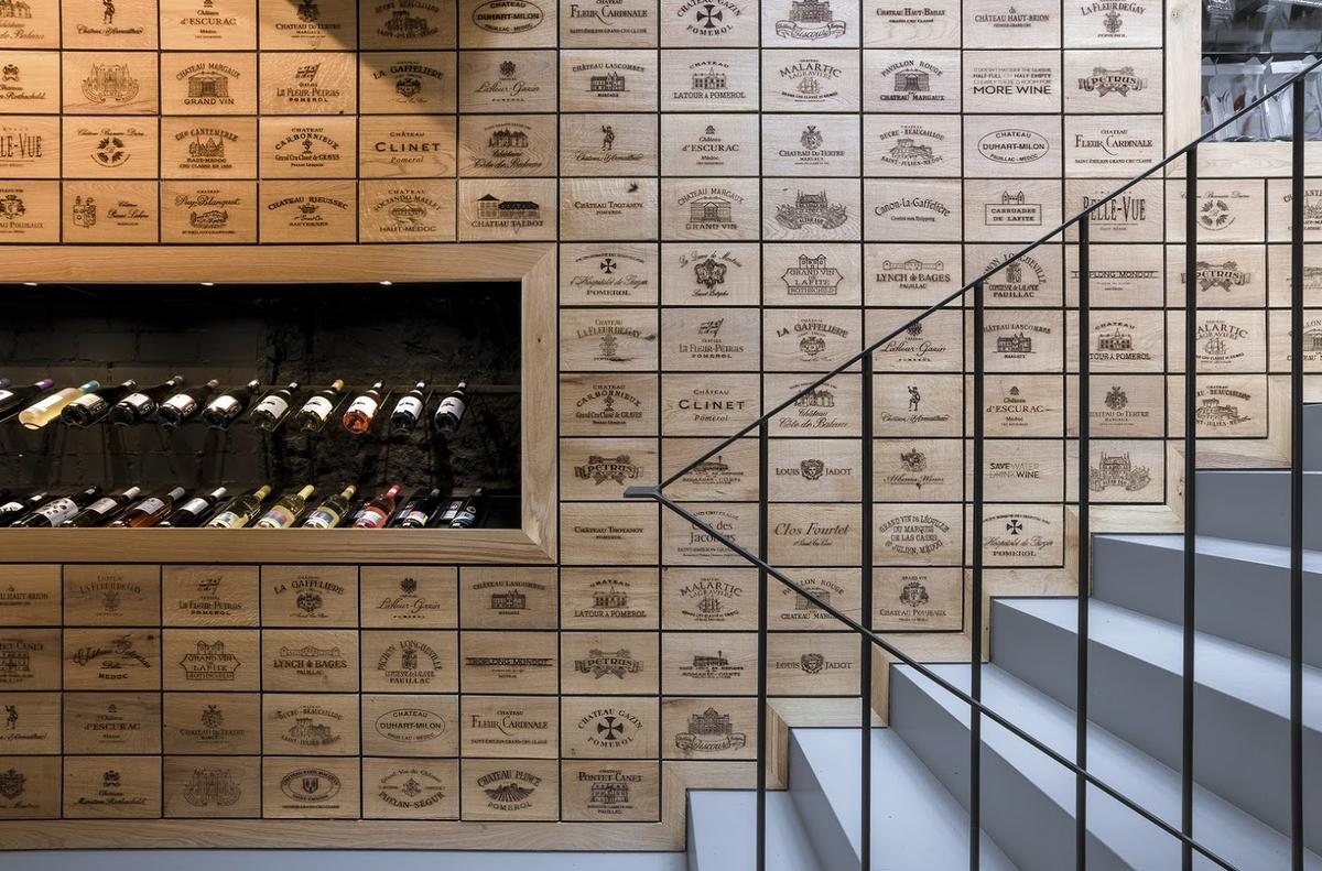 Por último destacar una de las genialidades de este estudio al desarrollar esta bonita Wine Shop. Las paredes están todas recubiertas de pequeños paneles de madera con el nombre de bodegas y marcas de vinos de toda clase. Pero esta pared esconde armarios donde los empleados guardan las copas o el stock de botellas. Un aprovechamiento super inteligente de los espacios que permite tener una tienda libre de distracciones, donde el protagonista es el vino de principio a fin. Donde el cliente viene, conoce el vino, aprende sobre él y lo compra. Seguro que vuelve otra vez.