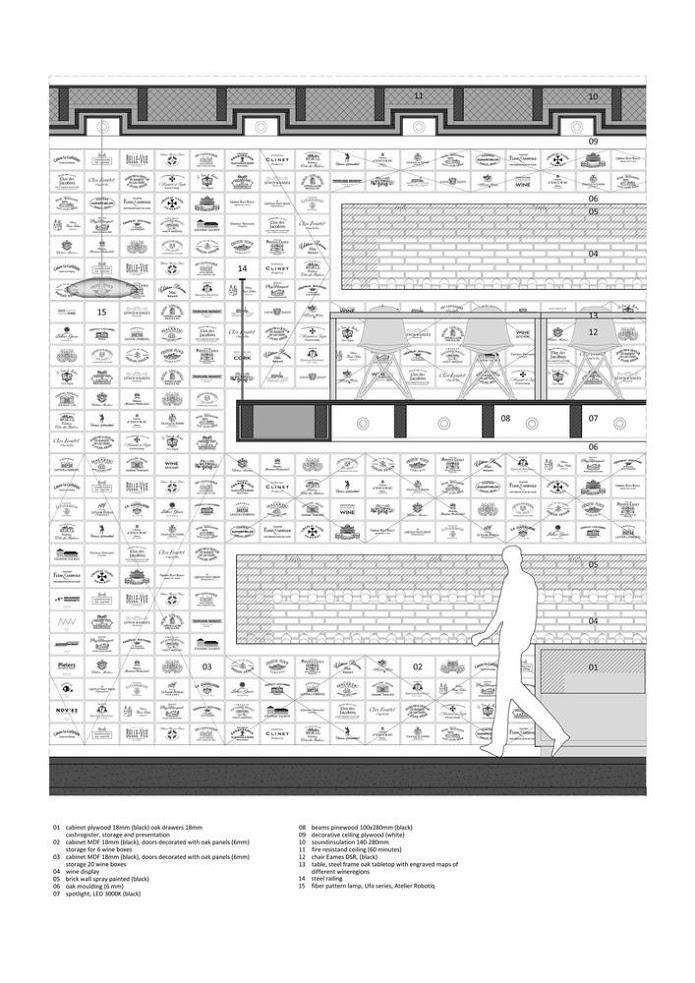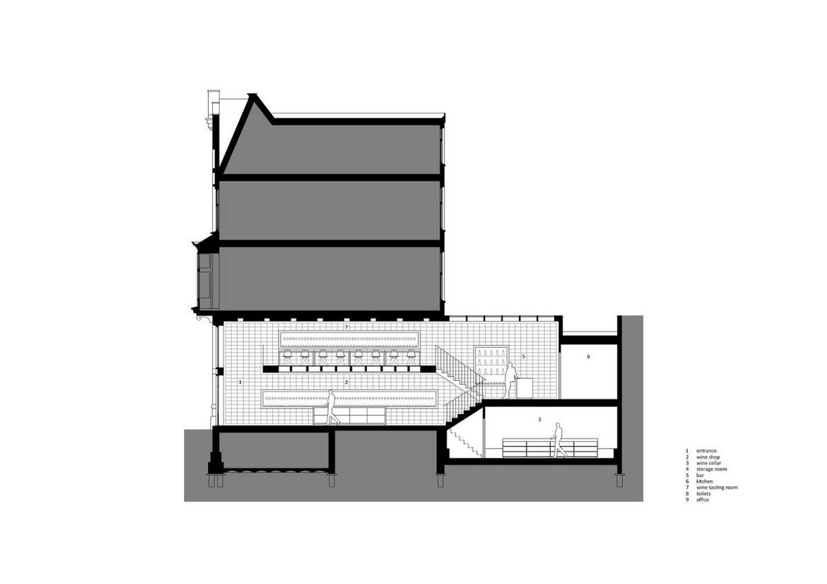 Después estaría un nivel intermedio con una barra donde poder degustar el vino que estás a punto de comprar y por último la zona alta. Esta zona alta está destinada para demostraciones a grupos o para dar algún tipo de curso sobre vinos. Un local muy pequeño pero muy bien estructurado donde están despachados todos los usos necesarios para este tipo de negocios y que sin duda sería una referencia en cualquier lugar que se desarrolle.
