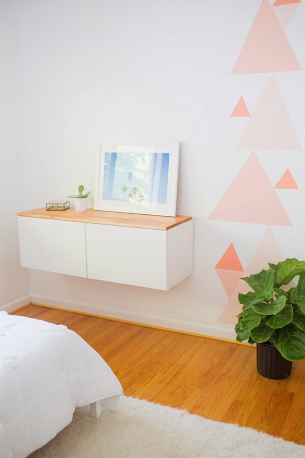 Desde el blog Sugar and Cloth nos llega una idea para crear una habitación de invitados (o para nosotras mismas, que yo me la pido encantada de la vida) a bajo coste. La solución es tirar de Ikea, pero dándole vidilla con un par de DIY fáciles y que quedan fenomenal. Uno de ellos, dibujando triángulos en la pared en diferentes intensidades de rosa, y el otro, añadiendo importancia a la típica estantería Besta de Ikeacon un sobre de madera. El resultado es una habitación luminosa, acogedora y con un aire femenino ideal.