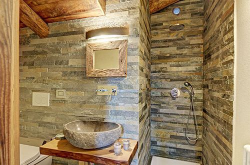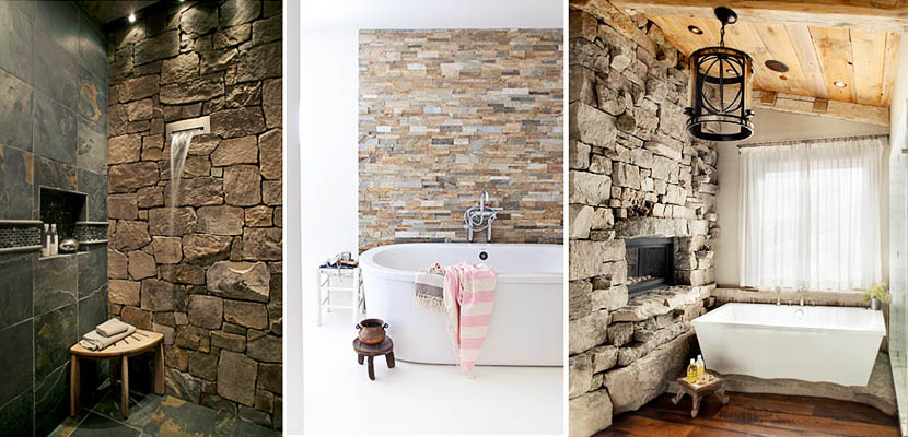 Las paredes de Piedra transmiten un gran aspecto rural acogedor a los baños rústicos