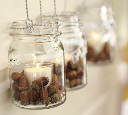 Pero si lo que quieres es decorar con velas, no te puede faltar el elemento decorativo principal del otoño que es la piña. Tan simple como hacerte con un bote de cristal, cuerda, un par de piñas pequeñas o unas bellotas y obtendrás un centro de mesa muy sencillito pero muy decorativo.