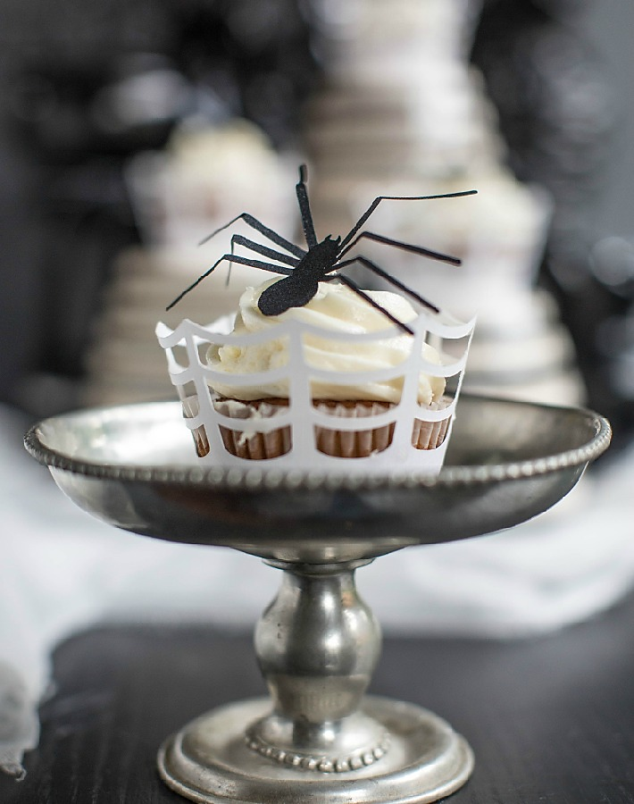 Esta idea de Lia Griffith me ha parecido muy sencilla para decorar las magdalenas, cupcakes o pequeños pastelitos. En su blog podrás encontrar los imprimibles tanto de la araña como de la tela de araña para decorar los dulces.