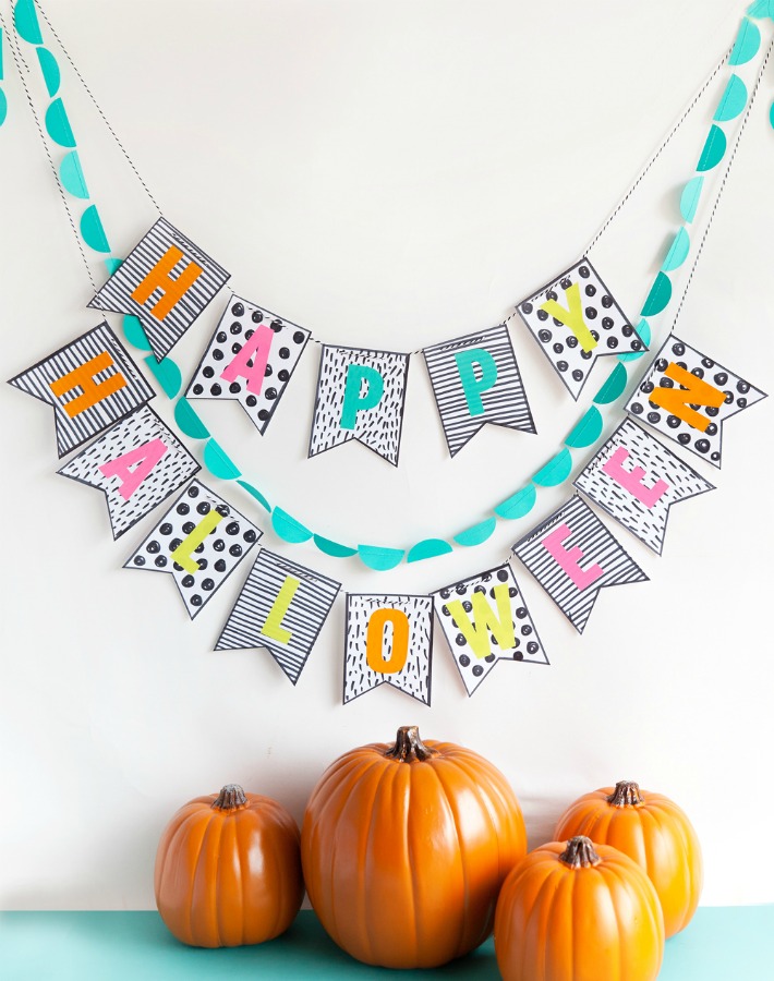 La verdad es que hay muchísimas guirnaldas terroríficas para la fiesta de Halloween, pero yo he preferido una más colorida y divertida. En el blog Tell love and party puedes encontrar el tutorial para decorar la fiesta de los peques.