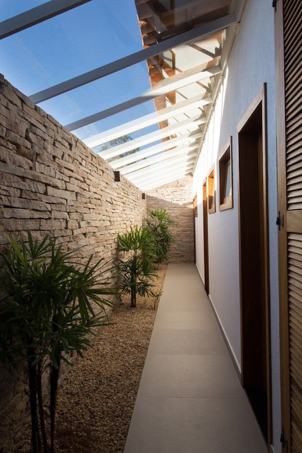 Este pasillo no es muy ancho, pero si muy largo. La pared de ladrillo hace que nos fijemos menos en su tamaño y los colores claros lo amplían visualmente.