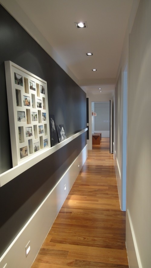Otra opción es aprovechar los pasillos para hacer una composición de cuadros como esta.