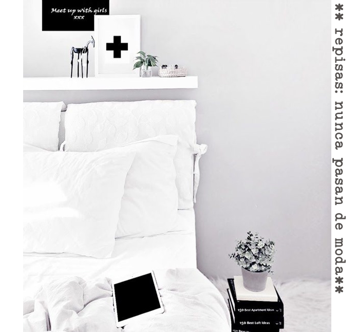 Es como tener la sensación de que mi habitación está "inacabada". Conste que no me molesta, pero al final siempre estoy muy pendiente, por ejemplo, cuando brujuleo por pinterest, a ver si por fin encuentro el PERFECTO. Y sabéis de qué me he dado cuenta...?? De que quizá lo que pasa, es que en realidad, no lo quiero. Me encanta mi pared blanca, que no me limita, me permite hacer DIY cuando me da la gana, puedo cambiar colores y estilo en la ropa de cama cuando llega otra estación... Vamos, que tan contenta que estoy y yo sin darme cuenta! Así que hoy va un poco de inspiración para esas camas con un NO-cabecero, que me encantan!