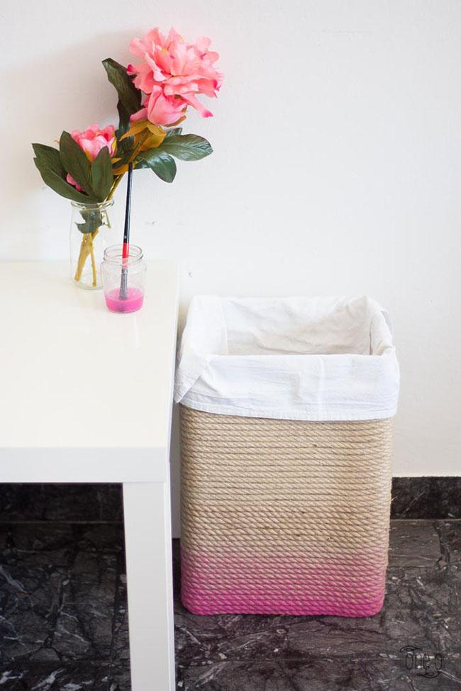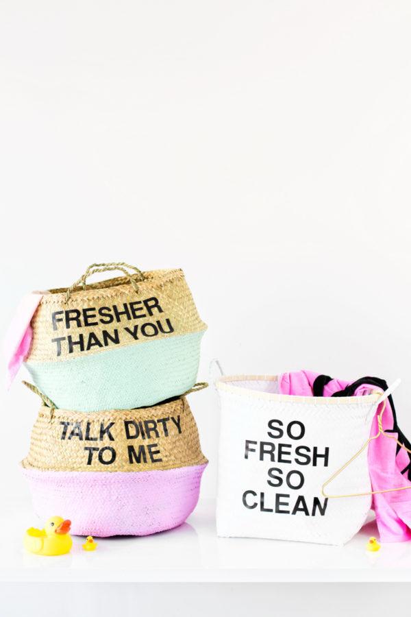 Fuente: Studio DIY Otra idea que me parece genial es utilizar la técnica del dip painting (o efecto sumergido) para pintar los cestos para la ropa. También resulta de lo más fácil. Solo tienes que tapar la parte superior del cesto y pintar la parte inferior, de forma que parezca que lo has sumergido en pintura hasta la mitad. Después puedes añadir unas letras si te gusta el resultado. Queda de lo más divertido, ¿no crees?