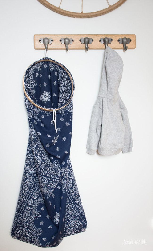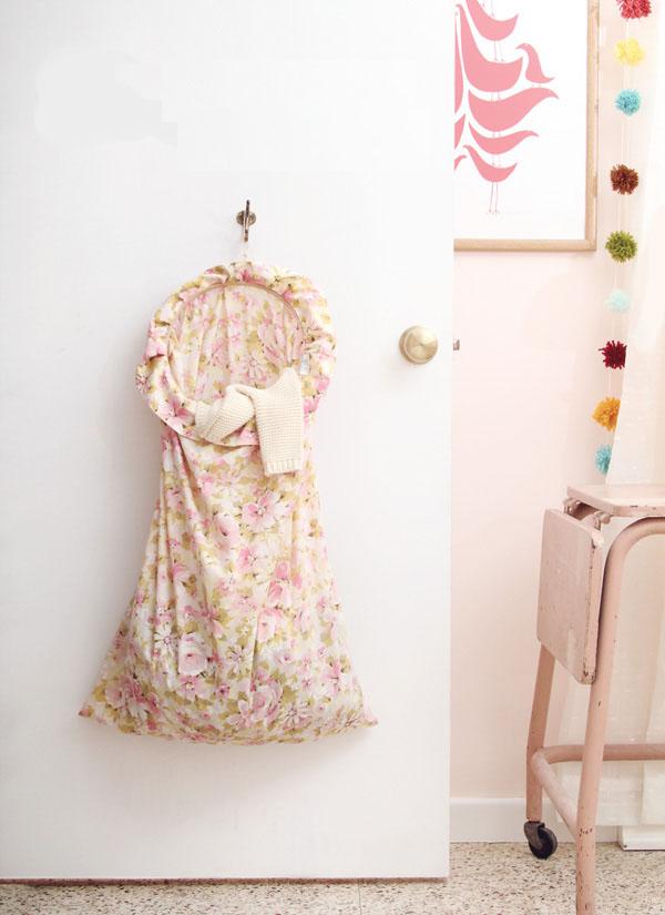 Fuente: Making Nice in the Midwest ¿Necesitas un cesto para la ropa pero apenas tienes espacio donde ponerlo? Aquí tienes una buenísima idea. Puedes coser tú mismo un cesto con tela y colgarlo de una percha.