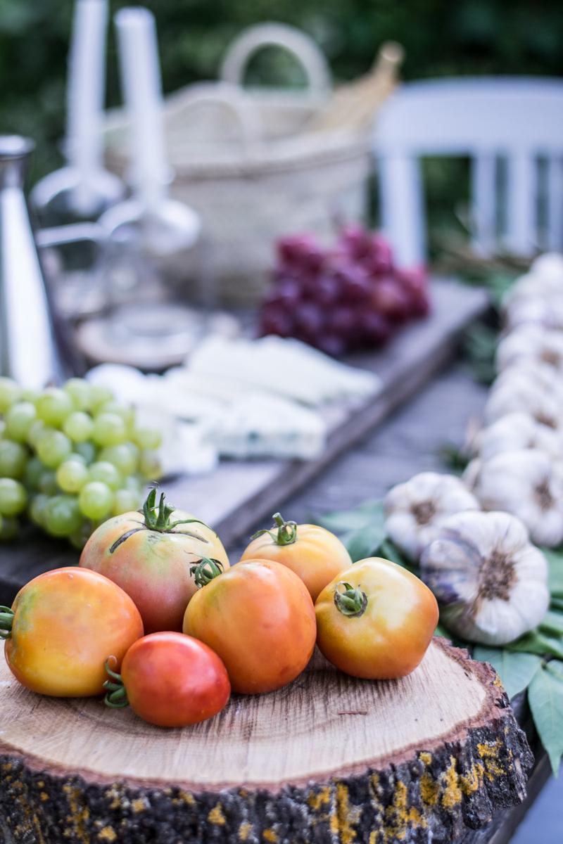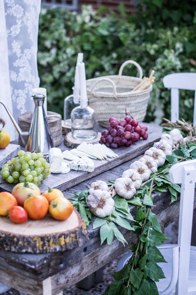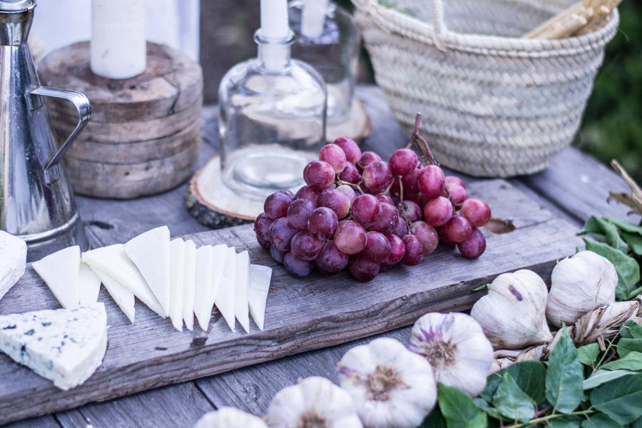 Para esta cena, utilicé una tabla grande que ocupaba casi toda la mesa y en ella organicé una tabla de quesos y fruta. Así te evitaras el uso de manteles y la mesa vestirá mucho más informal.