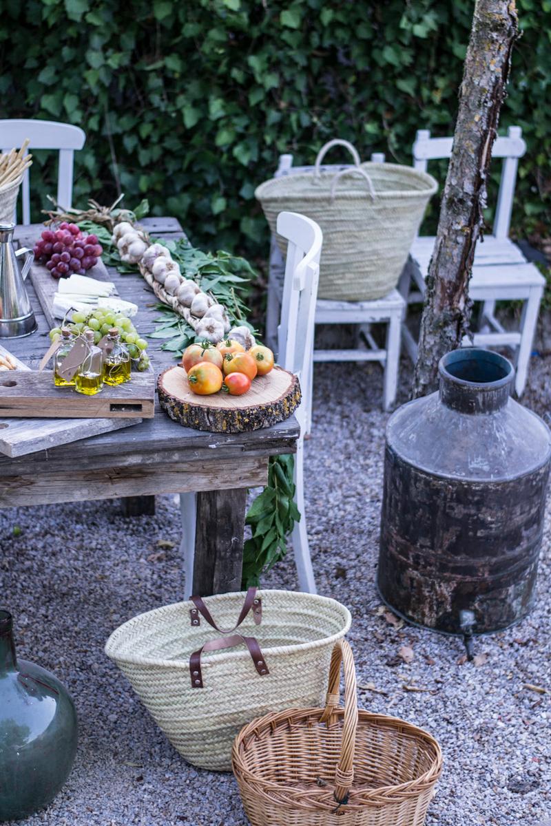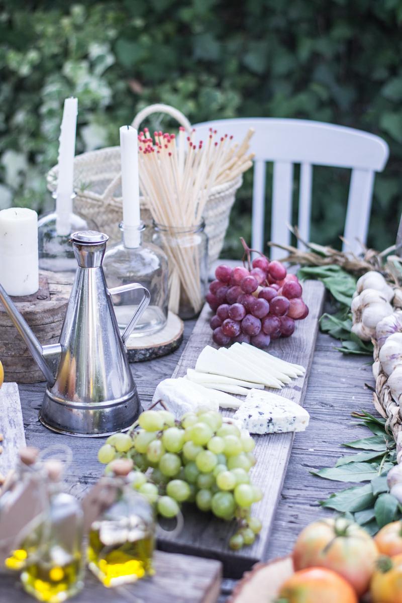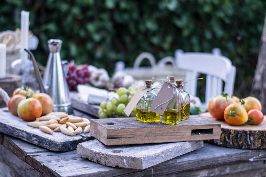 Otro diy de esta mesa con sabor mediterráneo, son unas botellitas de cristal, las que venden en cualquier bazar y vamos a colocar romero, hierbas provenzales, ajo, etc en cada botella algún elemento diferente y llénalo de aceite de oliva virgen extra. Luego prepara unas etiquetas y regálaselo a tus invitados cuando se vayan de la fiesta.
