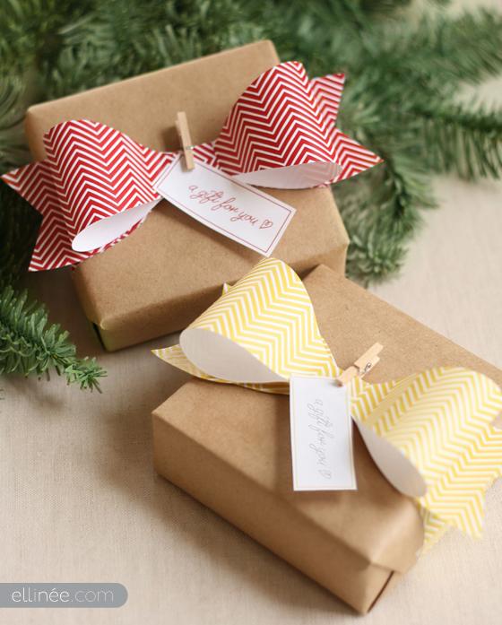 Por último, os dejo enlace a este DIY para hacer lazos de cartulina con el que me crucé al buscar imágenes para este post. Combinan muy bien con el papel kraft y me pareció otra buena idea para los regalos de esta Navidad.
