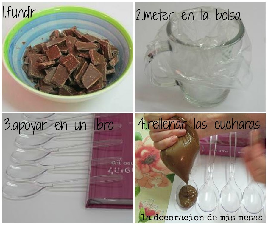 Hay 2 maneras de hacerlas, dependiendo del tipo de cuchara que vayas a usar. Si es la tradicional de plástico o de acero, quedará mejor el primer método, ya que esas cucharas tienen más fondo y admiten más cantidad de chocolate.Si por el contrario utilizas la cuchara de madera, la opción con el molde, tendrá mejores resultados.