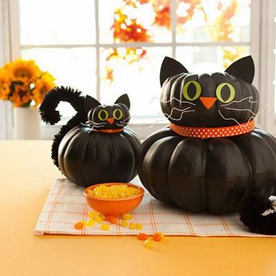 Pintamos de negro dos calabazas, una mas grande y otra mas pequeña y decoramos para que parezcan gatos. O podemos envolverlas en vendas, ponerles unos ojos de cartulina entre las vendas y ya tenemos otra decoración diferente.