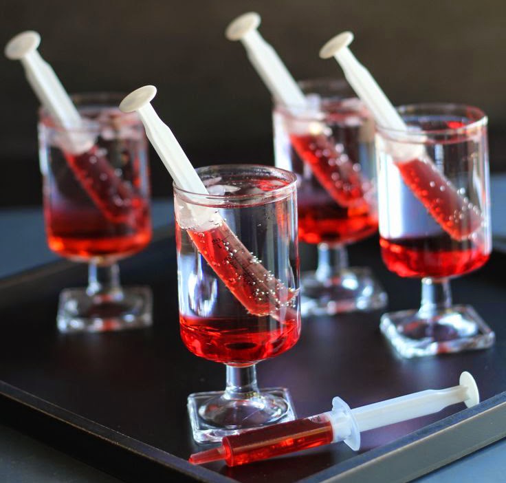Por último os dejo con esta idea. Un poco de bebida de granadina sin alcohol en un bol, servida en jeringuillas. Parecerá sangre totalmente.