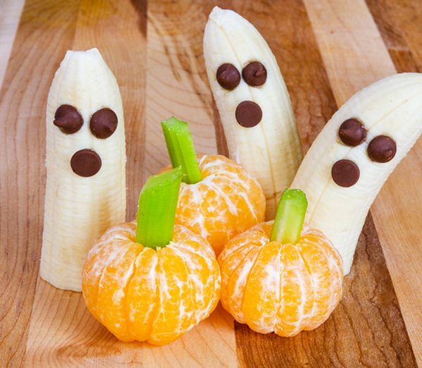 Una buena alternativa a tantas chuches y que los peques coman de manera mas saludable es camuflar las frutas con formas acordes al evento, en este caso para celebrar Halloween.