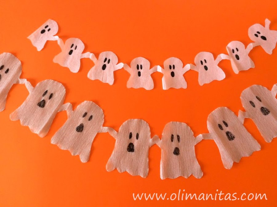 4. Guirnaldas de fantasmas. Este tipo de recortables puedes hacerlos de fantasmas, de arañas, de murciélagos, busca en internet el modelo que más te guste. Te dejamos el enlace para hacer el de fantasmas aquí.