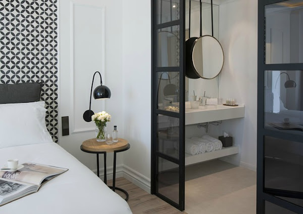 Un tabique de cristal. Aún recuero un hotel en el que estuve alojada en el que la pared de la ducha que separaba baño y dormitorio era de cristal opaco. Sencillamente maravilloso. Tanto el aporte de luz natural cómo el efecto estético y decorativo.