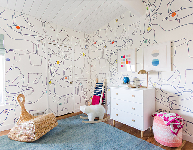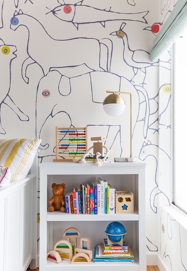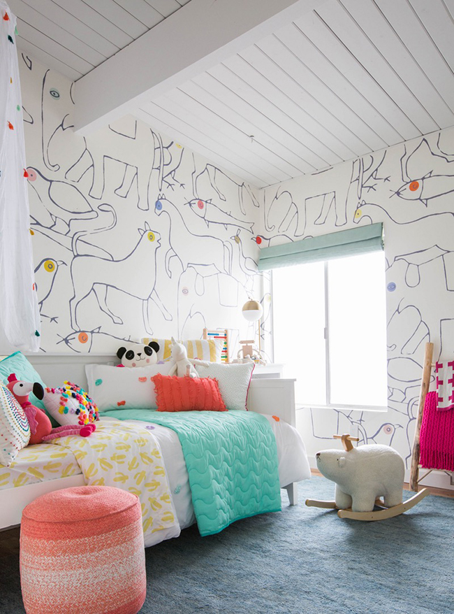 Este tipo de habitaciones requieren una base blanca en la mayoría de los cosas y como aquí el color lo dan textiles y complementos como jueguetes, libros, cuadros... además por si no fuera poco han añadido un papel pintado de lo más arriesgado porque no solo han empapelado una pared sino todas... ¡HASTA LA PUERTA DE ACCESO!