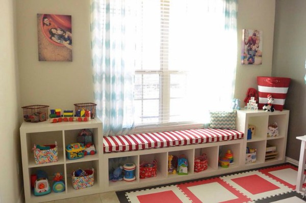 Muy útiles sobre todo en zonas de juego y de uso infantil. Tumba la estantería y coloca un largo cojín acolchado en la parte superior. Compleméntalo con muchos más de menor tamaño. Los amplios huecos inferiores desahogarán muchísimo la estancia, fomentarán que tengan todo recogido y a la vez tendrán todos sus juguetes y tesoros más preciados bien cerca de ellos y a buen recaudo.
