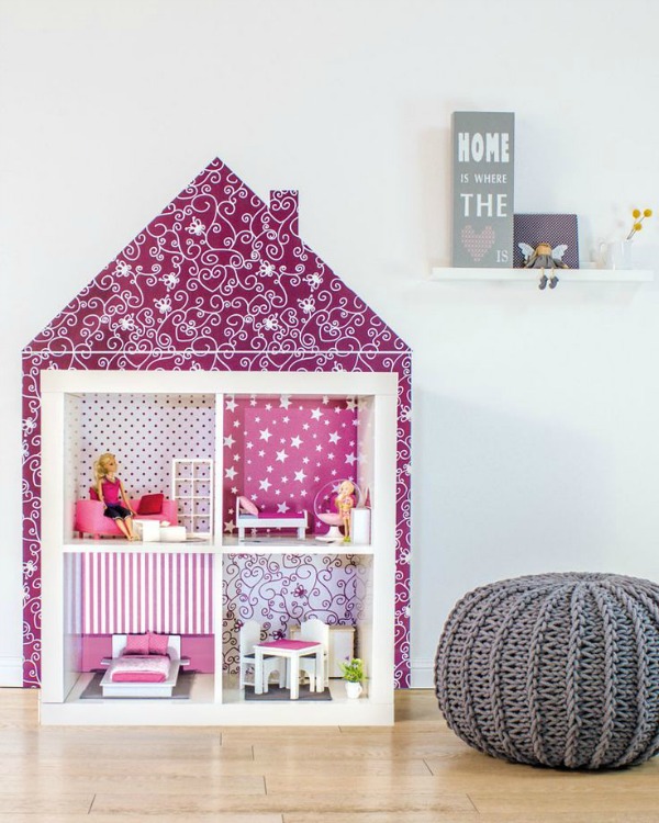 Observa el efecto conseguido al girar la última de estas 3 estanterías. Hacerlo ha proporcionado una superficie lisa que se ha transformado en pizarra. Un detalle tan original como práctico que marca la diferencia en la estancia. En la imagen que le sigue, ha bastado con empapelar la trasera de la estantería antes de montarla para conseguir un efecto la mar de alegre y diferente.