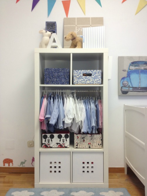 Fíjate qué fácilmente se ha adaptado ésta a la necesidad de almacenar la ropita del peque de la casa. Cuando crezca y pasemos todo a un armario de mayores dimensiones, no tendremos más que volver a reubicar nuestra estantería en otro rincón de la casa que precise sus servicios. Es lo que tiene servir igual para un roto que para un descosido ;)