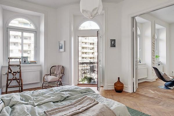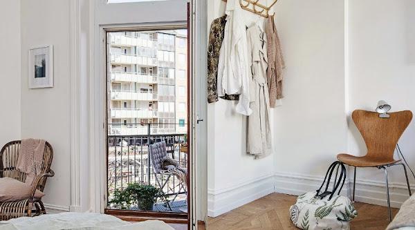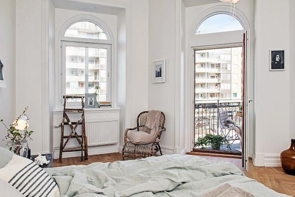 También podemos observar una escalera manchada de restos de pintura como objeto decorativo y un antiguo sillón de rattán situado junto a la salida al balcón para crear una zona de relax o lectura.