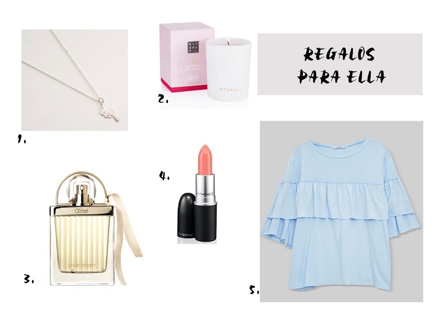 1. Colgante palmera HOLIBIA | 2. Vela arómatica RITUALS | 3. Perfume Love Story Chloé | 4. Barra de Labios MAC | 5. Camiseta volantes Pull&Bear
