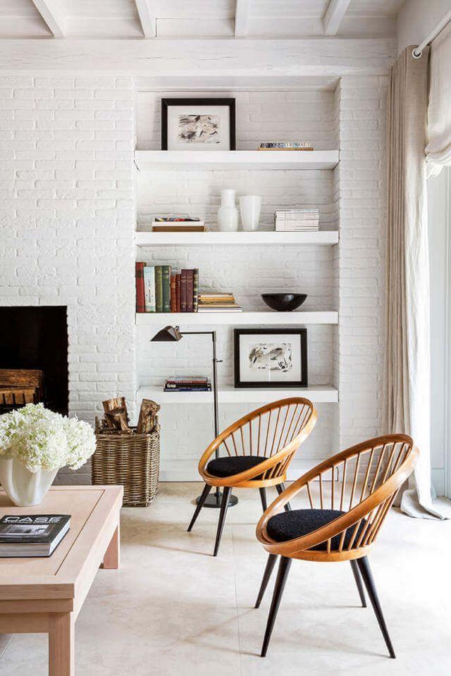 Me gusta este tipo de estanterías que se integran en el espacio pero aportan textura con el ladrillo pintado en blanco.