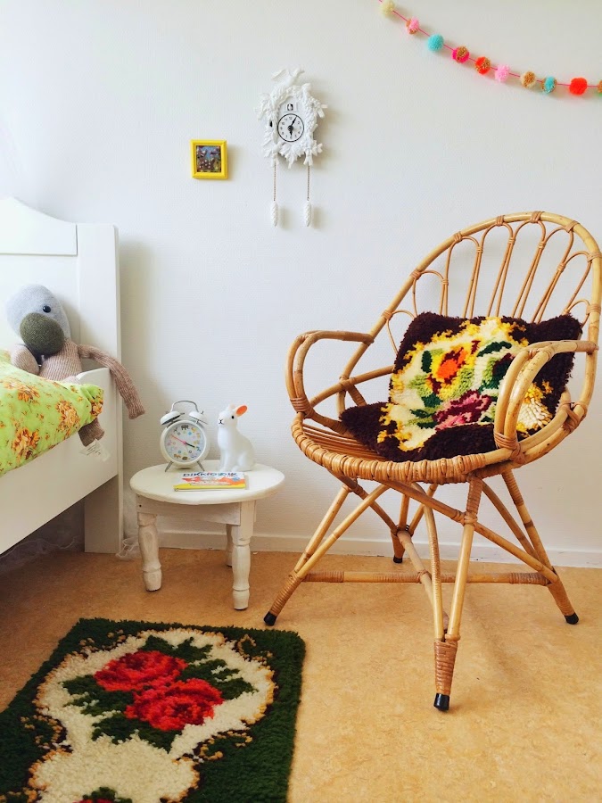 Para terminar la semana de la forma más alegre y vitalista que podemos, hemos seleccionado un dormitorio infantil en el que no faltan bonitos detalles que lo hacen muy agradable. Con poco dinero pero con unas ideas maravillosas, el dormitorio se convierte en el escenario perfecto para contar cuentos. Con una silla reciclada de terraza, una mesita de madera y un par de guirnaldas han conseguido crear un clima realmente hechizador. Me ha gustado especialmente la idea de decorar la pared con un pequeño cucú, (igual que el que tenía mi hermano en su habitación cuando éramos pequeños, y que todavía yo conservo). Color, color y más color  es la clave para que nada más ver el espacio nos resulte embaucador...