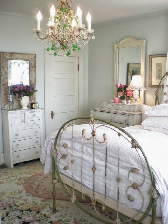 http://hollyrecommends.wordpress.com/En los dormitorios es habitual encontrar cabeceros de hierro o de forja, pero también se pueden utilizar elementos viejos de madera (como puertas recicladas,?). Las mesitas de noches y las cómodas están pintadas en colores blancos o cremas y presentan un aspecto envejecido, lo que les confiere un toque romántico ideal para esta estancia.