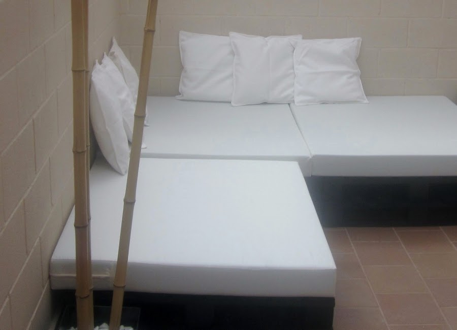 y colchones a medida con fundas en color blanco roto.