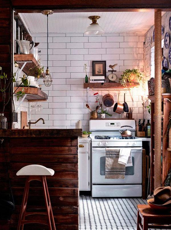 En cuanto a las tendencias, lo mejor es apostar por la mezcla, como en la cocina de la foto: maderas recuperadas en un tono medio u oscuro que contrastan con la blancura de los azulejos de tipo metro, y con el brillo matizado de los objetos de cobre. Una cocina pequeña pero de lo más actual y chic.