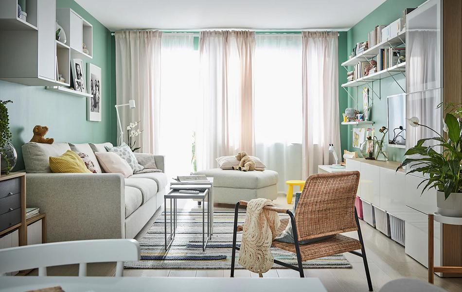 Aleja los muebles más grandes de las ventanas y de las puertas, si estas tienen paneles de cristal. No coloques estanterías en medio del salón, mejor pégalas a las paredes. Que nada obstaculice el paso de la luz diurna.