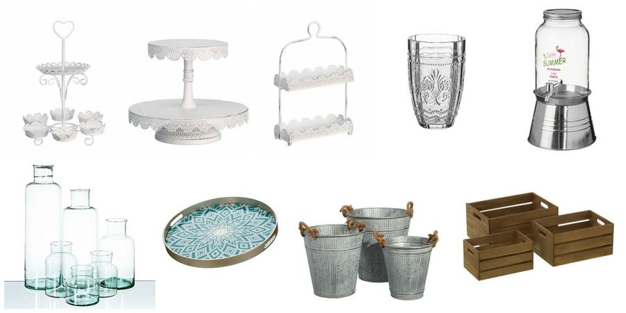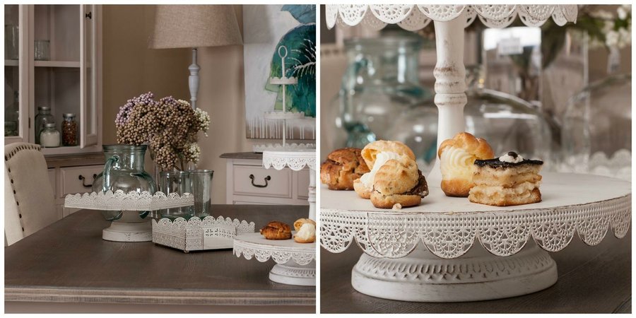 Para los dulces o la tarta necesitarás unas pasteleras como estas de metal blanco. También, puedes utilizar botes de cristal para llenarlos de golosinas o, incluso, cubos de metal para un toque más rústico. Aprovecha las cajas de madera para hacer diferentes alturas dentro de la mesa o crear con ellas la estructura de la candy bar.