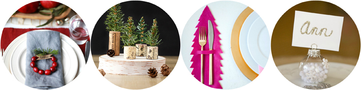 1. Sitting hecho con uvas y trocitos de abeto | 2. Centro de mesa para los aficionados al vino | 3. Guarda cubiertos con forma de árbol | 4. Sitting con una bola navideña y puerpurina