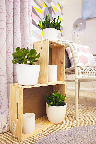 El toque de "verde" es siempre un acierto, aprovechamos para añadir plantas naturales junto con la mezcla de las cajas de madera natural, era el toque cálido y acogedor que le faltaba.