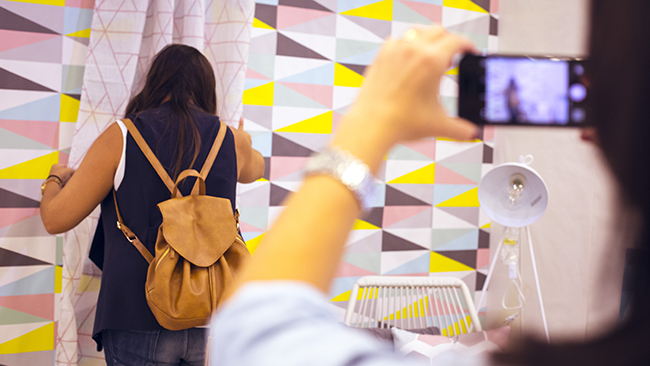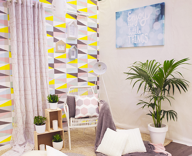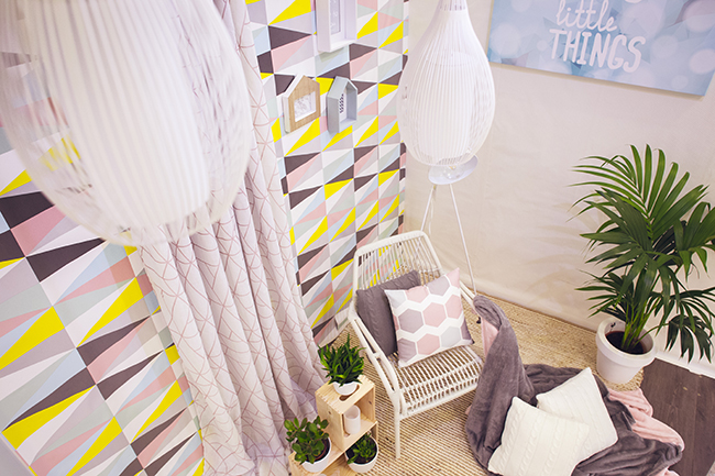 Este sin duda es mi ambiente favorito, las claves eran integrar este papel con los diferentes estampados y propuestas nórdicas ¿mezclar texturas, colores y formas? Creíamos que sería imposible pero poco a poco el ambiente lleno de formas geométricas y colores pastel fue tomando forma.