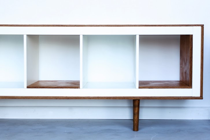 O la misma estantería Expedit pero forrada con unos tablones y 4 patas en madera de arce, la convierten en una pieza de diseño: