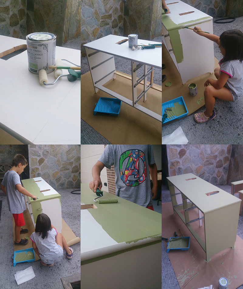 ¡Hora de pintar y todos manos a la obra! La verdad es que con esta pintura es muy sencillo pintar, y con dos capas de pintura ya lo teníamos... pero nos apetecía darle un aspecto de desgastado, de más viejo... y echando mano a la lijadora, desgastamos el mueble.