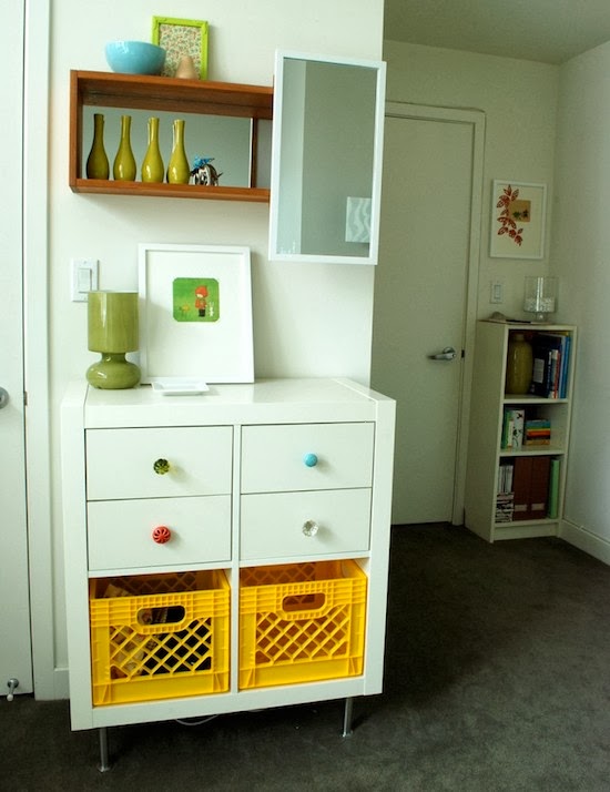 Terminamos con esta Expedit transformada en una cajonera para una nursery; para copiar la idea de usar perillas diferentes para cada cajón, y los cajones plásticos de fruta de color.