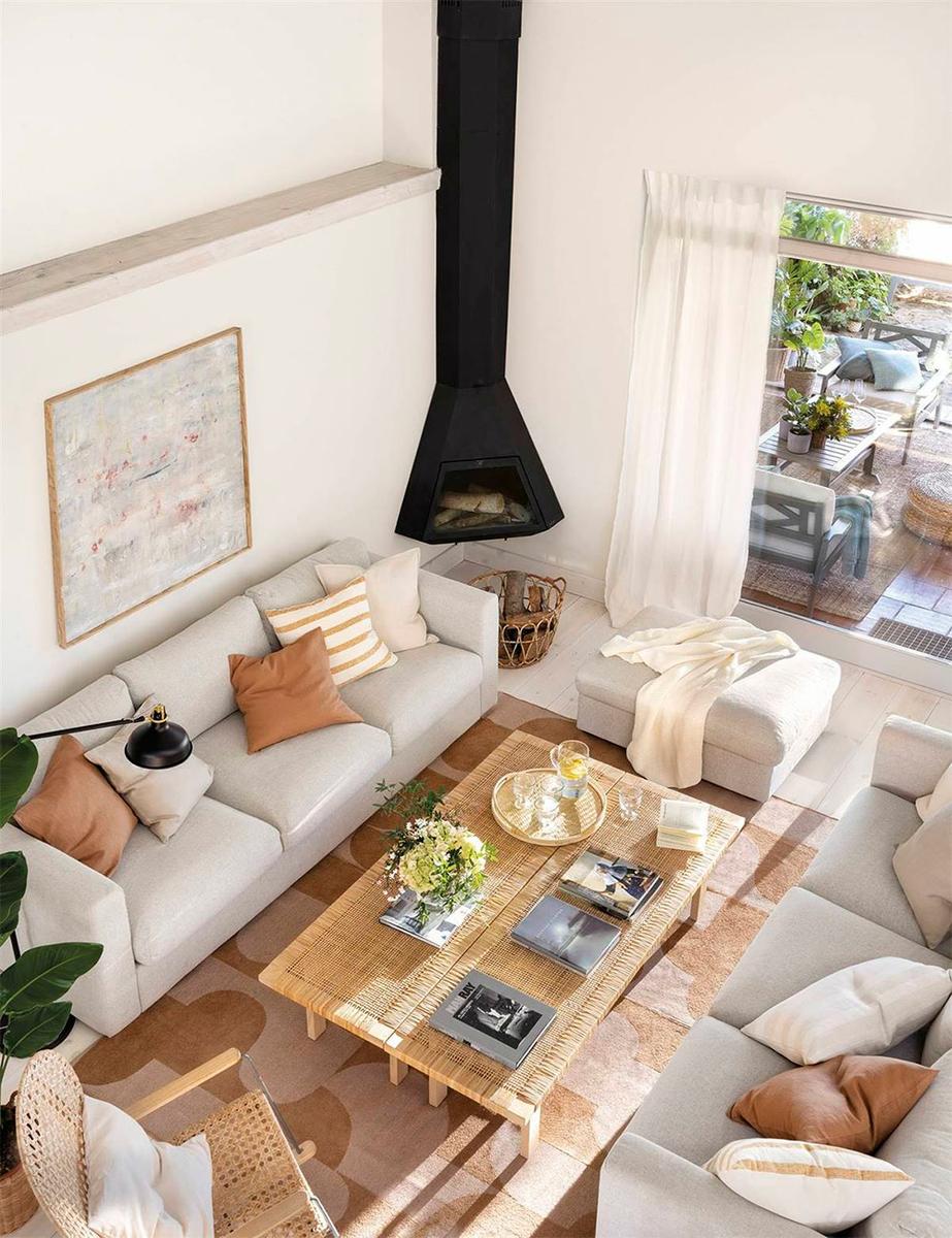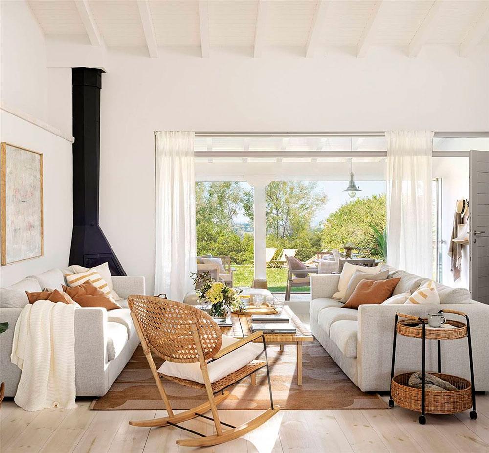 Apostó por una vivienda abierta al exterior, quería captar toda la luz posible. Así, el blanco fue el protagonista. En el salón coloco dos sofás enfrentados modelo Vimle, con mesa auxiliar Lubban y como mesa de centro, dos bancos Stockholm. La mecedora es la butaca Grönadal. El cuadro sobre el sofá, del artista Carlos Arriaga. La luminosidad del salón se ha conseguido gracias a una paleta de color en tonos blanco, tierras y grises, a la que la interiorista ha añadido estratégicamente puntos de interés en negro, como la chimenea, la lámpara de pie Ranarp del salón, o como mencionaba antes, los ribetes pintados por ella mima en la vitrina Hennes.