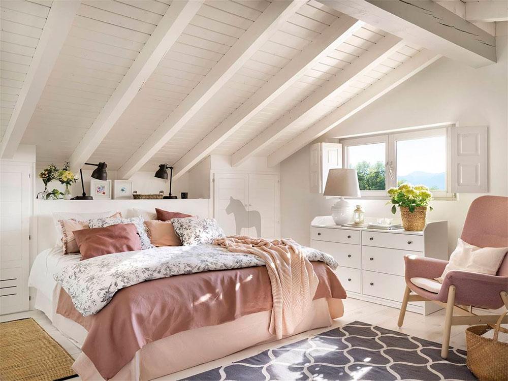 El dormitorio se encuentra en la parte superior de la vivienda, está abuhardillado con vigas vistas, lo que le da un aire de cabaña. Junto con el blanco predominante en toda la casa, se ha decorado en rosa empolvado (tanto la ropa de cama como la butaca Vedbo a los pies de esta), un tono romántico y que transmite calma para dormir. En la parte más baja se ha aprovechado para poner una zona de armarios, completando el almacenaje con la cómoda Hauga.
