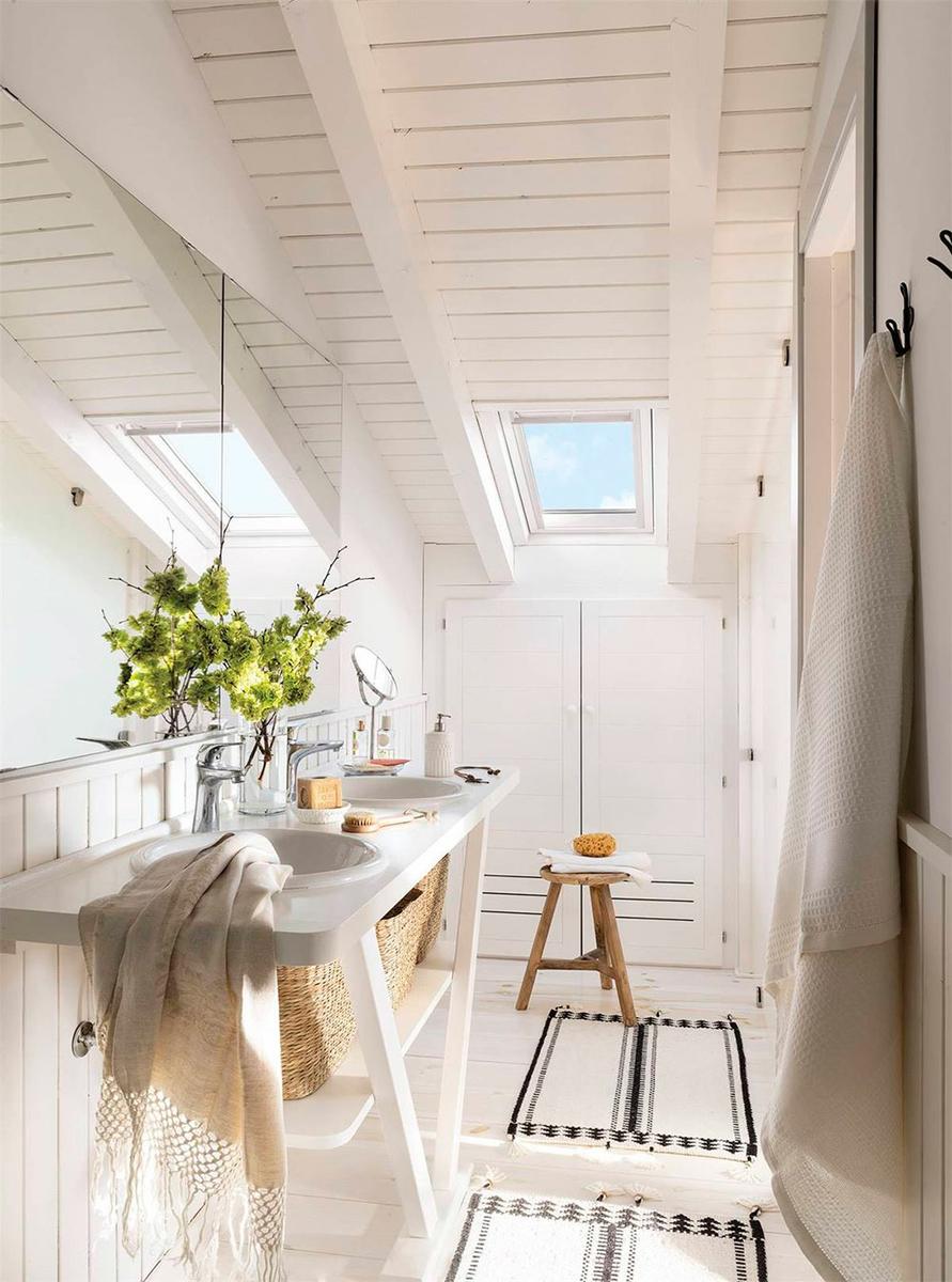 En el baño se respira limpieza y frescor. Aquí se ha salido un poco del mundo Ikea, con un bonito y original mueble realizado a medida y griferías de Roca. Las toallas y el taburete son antiguos.